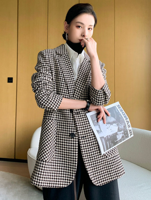 Damenbekleidung Hahnentritt-Wollanzugjacke für Damen, kurzer Stil, Herbst und Winter, neues Temperament, vielseitiger karierter Wollmantel für Damen