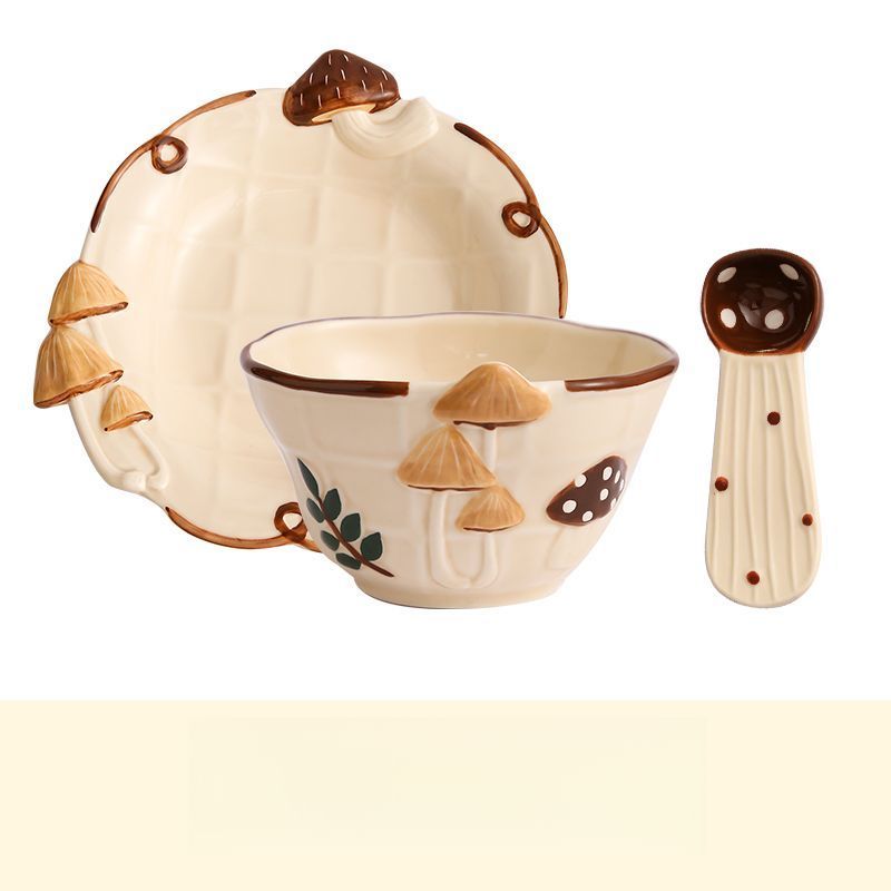 Mushroom Underglaze Rice Cute Relief Ceramic Single Serving Household Bowl Plate High-Value Tableware Personal Use