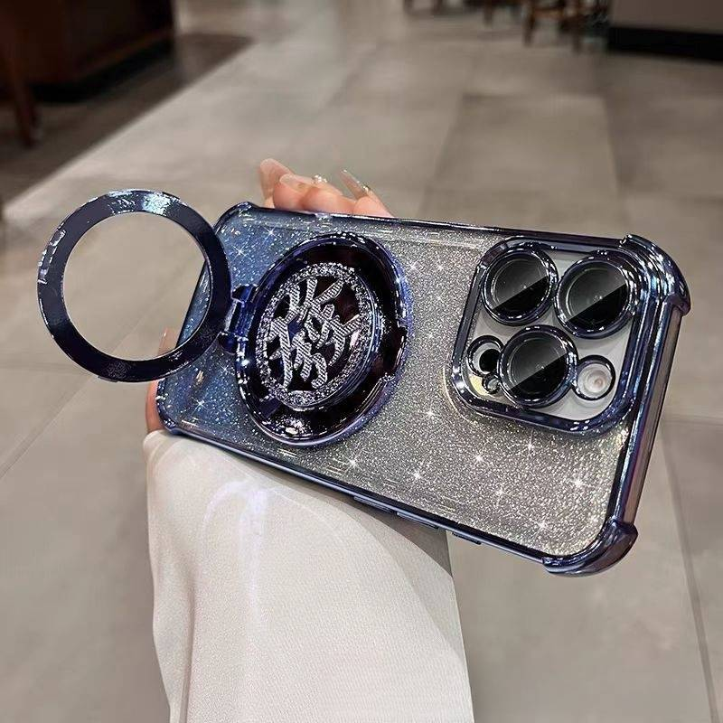 IPhone 16 Pro Max İçin Parıltılı Köşe Manyetik Stand Kılıf - Elektrokaplama Parıltılı Döner Üst Tasarım, iPhone 14/15'e de Uyar