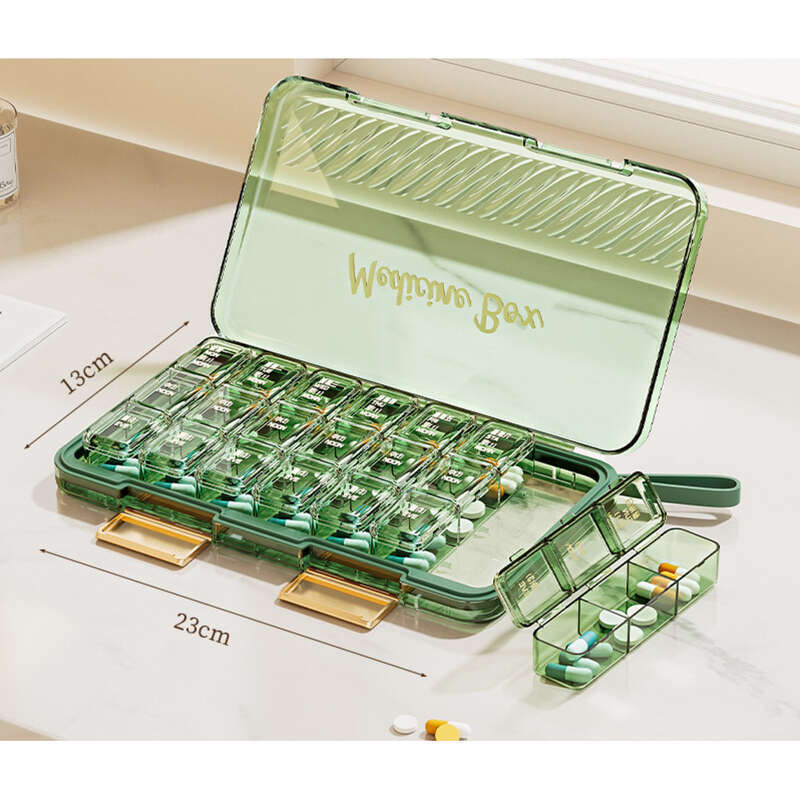 A forgotten medicine storage box divided into transparent small plastic boxes with lids, 7 days a week, with multiple compartments for portable medicine boxes