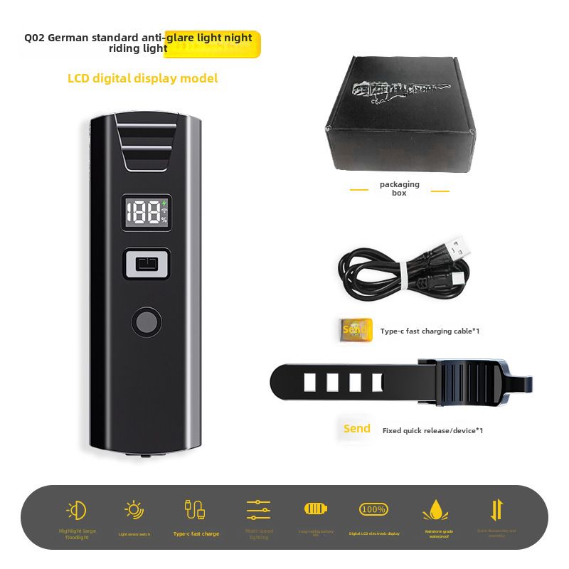 Intelligent Light Sensor:Equipped with an intelligent light sensor, this bicycle light ensures optimal lighting for night cycg, enhancing safety and visibility on the road. USB Rechargeable:The USB rechargeable design of this bicycle light makes it convenient and easy to refill, eliminating the need for traditional battery replacements. High Brighess Flashlight:This product features a high-brighess flashlight, providing powerful illumination for your cycg adventures, even in low-light conditions. Versatile Use:Designed as a versatile cycg accessory, this light can be used as a bicycle front light or a handheld flashlight, serving multiple purposes. Durable Construction:Crafted with durability in mind, this bicycle light withstands the rigors of daily use, ensuring long-lasting performance for your riding needs. Easy Installation:With its simple design, This bicycle light can be easily installed on your bike, making it a hassle-free addition to your riding gear.