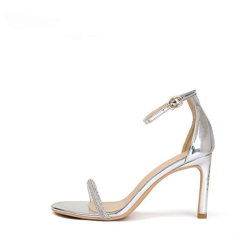 Silver high-heeled shoes with a single strap for spring and summer 2025, featuring a fairy style and versatile temperament. Lacquer leather, rhinestone, fine heeled sandals for women