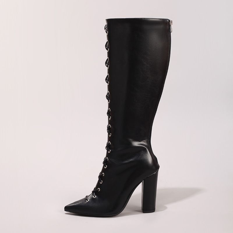 Lace-Up Burgundy Knee-High Boots Pointed-Toe Chunky Heel Long Boots 2025 Fall/Winter New