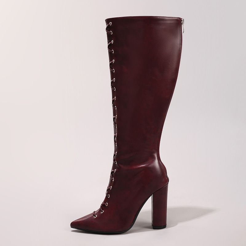 Women's Lace-Up Burgundy Knee-High Boots Pointed-Toe Chunky Heel Long Boots 2025 Fall/Winter New