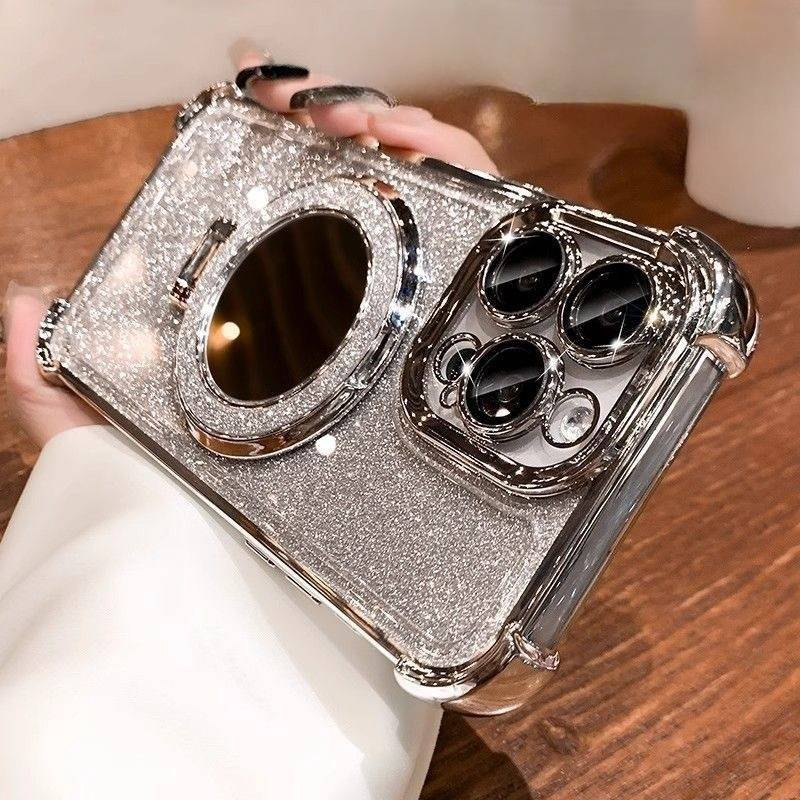 Custodia magnetica con supporto e motivo a specchio glitterato per iPhone 15/14 - TPU morbido trasparente con angoli rinforzati e finitura elettrolitica