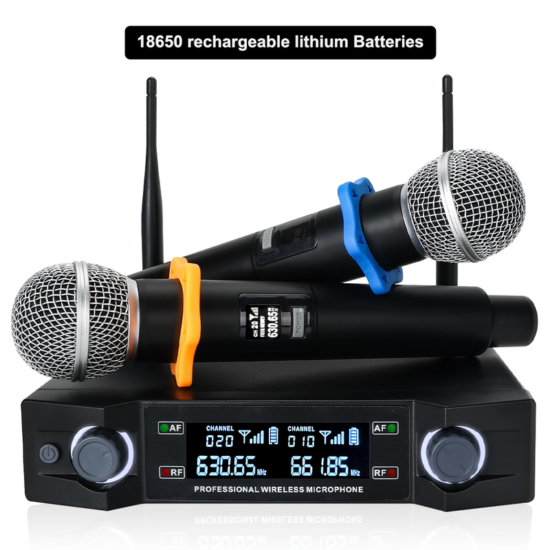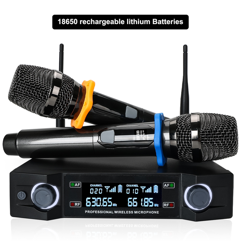 This recording device focused on karaoke singing is a dual channel UHF wireless microphone system equipped with 2 dynamic microphones, providing high audio quality, high compatibility, easy to set up, and intuitive display.