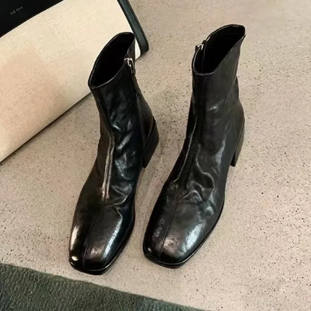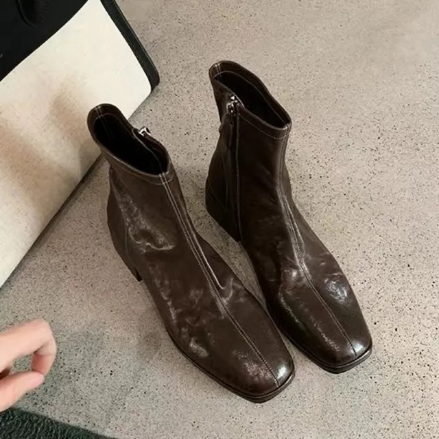 Genuine Leather Heels Thick Soles Square Toe Women Short Zippered Design Casual Fashion Versatile Slim Boots 4.5CM