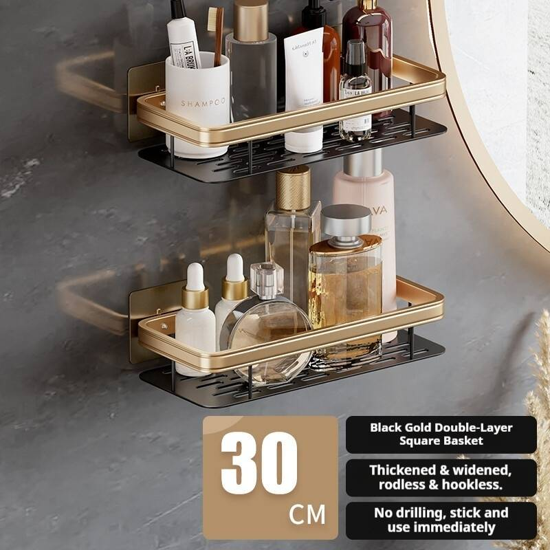 Tired of tangled towels and scattered toiletries? Our sleek black-gold shelf organizes everything with 3 spacious tiers + bonus hooks, all without drilling a single hole.