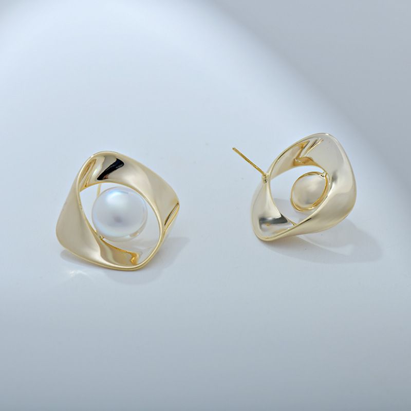 Sweet M ö bius Mabe Pearl Earrings with French Style Design, Simple and High Grade Pearl Silver Needle Earrings