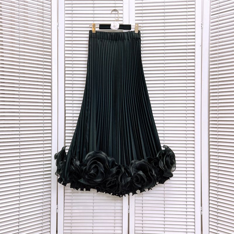 Women’s Clothing spring and summer new elastic waist A line three dimensional flower pleated temperament mid length skirt ruffled skirt half skirt
